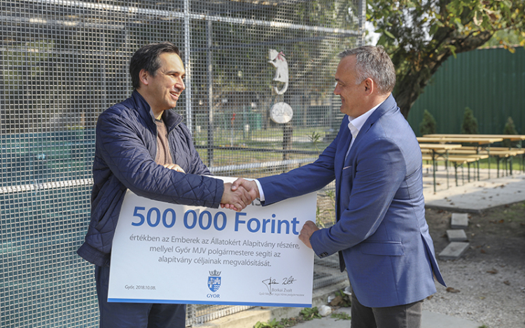 Ezt követően ötszázezer forintot nyújtott át Nagy Péternek, a Győri Állatmenhely vezetőjének, amellyel a város nevében támogatni kívánja az Emberek az Állatokért Alapítványt – a menhely üzemeltetőjét – céljai megvalósításában. – Szeretem az állatokat, és mindig figyelemmel kísérjük a győri lakosok érdeklődését is – mondta Borkai Zsolt arról, miért döntöttek úgy, hogy a menhelynek adományoznak. Hozzátette, reméli, hogy ezzel a pénzösszeggel hozzájárulhatnak ahhoz, hogy sok cica és kutya találjon gazdára. Kiemelte, ez a támogatás nem egyszeri alkalom, a városvezetés ezentúl minden évben szeretné segíteni a menhelyi állatok sorsát, hiszen itt méltó körülmények között élhetnek a gazdátlan ebek és macskák, míg otthonra nem lelnek.