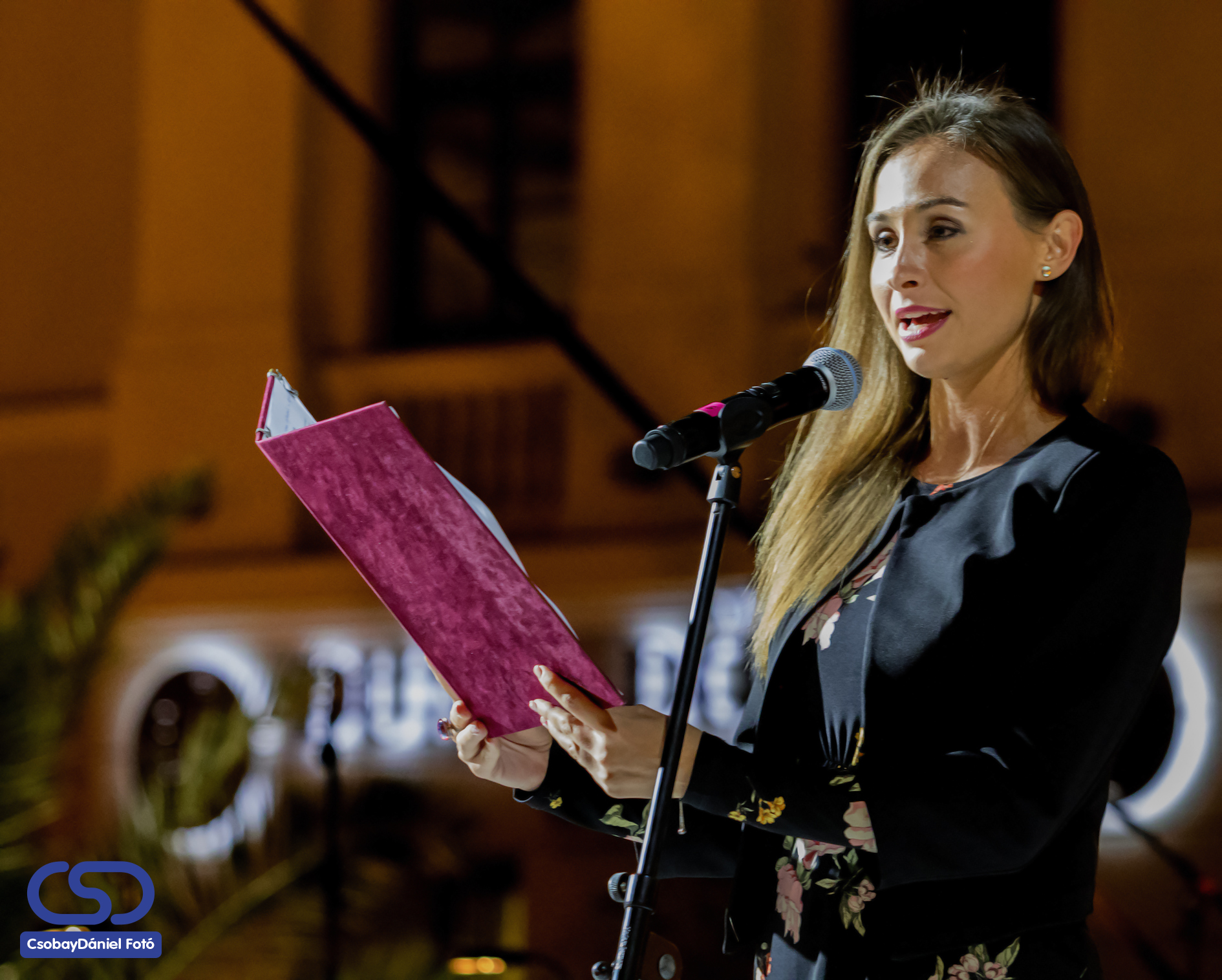 Kép: Dunai Csenge színésznő az Európa Kulturális Fővárosa EKF-Gálán konferál Győrben, 2018 nyarán. - Fotó: Csobay Dániel fotográfus