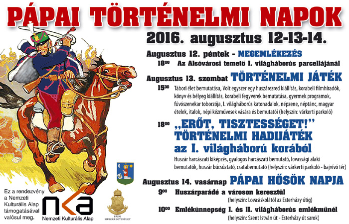 Tóth Kálmán, a rendező Pápai Huszáregyesület hagyományőrző zászlósa elmondta: augusztus 13-án szombaton délután három órától táboriélet-bemutató, első világháborús kiállítás, korabeli fegyverbemutató, filmhíradók, könyv- és bélyegkiállítás, valamint gyermekprogramok várják az érdeklődőket.