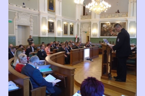 Váczi Attila r. alezredes, megbízott kapitányságvezető Győr Megyei Jogú Város Közgyűlése előtt számolt be a Győri Rendőrkapitányság 2015. évi tevékenységéről 2016. április 29-én.