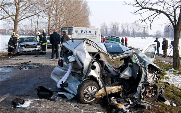 Helyszínelők dolgoznak a Szigetközben, Dunaszeg és Győrladamér között, ahol egy győri házaspár halt meg egy hármas közlekedési balesetben 2013. február 18-án. A házaspár autójával egy a sávját elhagyó furgon ütközött frontálisan. A vétkes jármű sofőrjét és utasát, valamint a két roncsnak csapódó harmadik autó vezetőjét, egy várandós nőt a mentők a győri kórházba szállították.