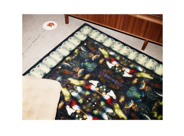 „A szőnyeg világos széle egy porcelán balerina szoknyájából készült. A szőnyegen porcelánmadarak is megjelennek, a köztük lévő üresen hagyott részek körvonalai is titokzatos mintákká állnak össze. A szőnyeg különleges világában szabadon elveszhetsz, akár csak az olasz kárpitok kusza hímzéseiben.”
