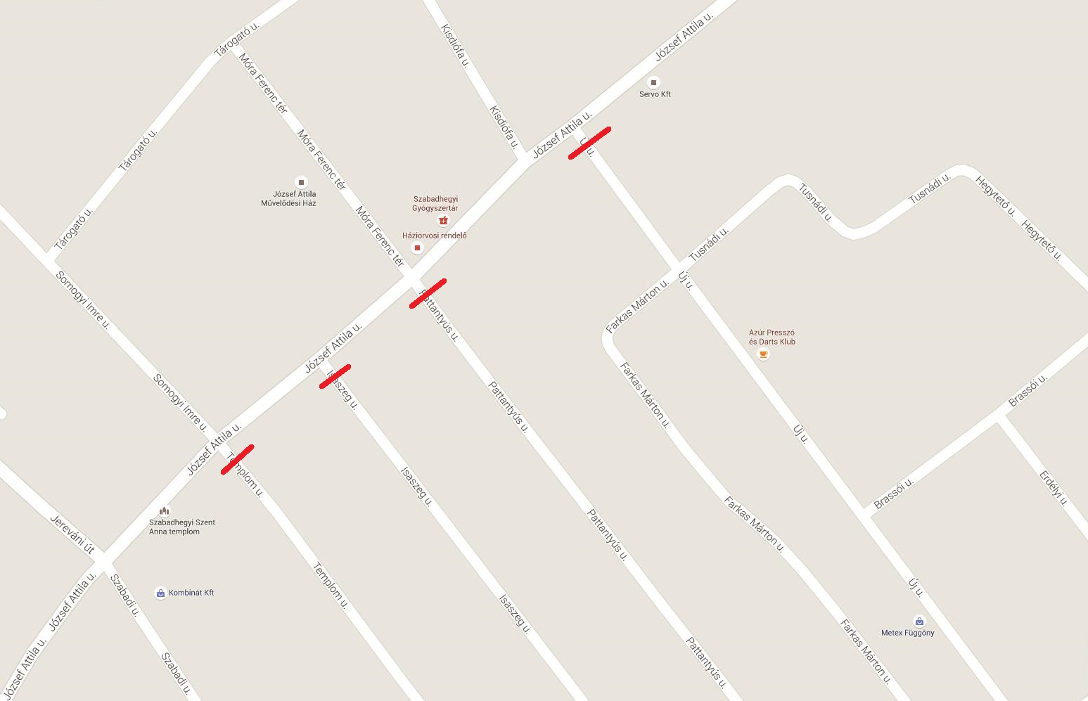 A mellékelt térképen jelöltük piros színnel az érintett utcákban várható teljes szélességű zárások helyét!