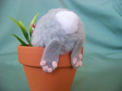 A másik nagy kedvenc, amikor egy plüss vagy papír nyuszi félig belemászik a cserépbe. Több virágárusnál is fellelhető ez a kombináció. Aki pedig érez hajlamot, egyszerűen otthon is elkészítheti, többféle kivitelezésben.