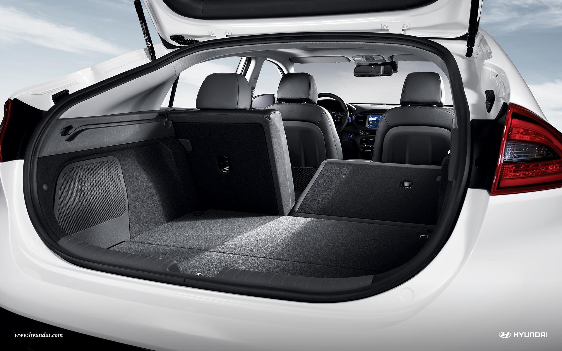 Azért akad még olyan terület, amin dolgozni kell a Hyundai fejlesztőmérnökeinek, mert a nagy dőlésszögű hátsó ablak miatt hátrafelé kissé korlátozott a kilátásunk. Ennek ellensúlyozására legalább van tolatókameránk, amit az alapfelszereltség részeként kapunk az autóhoz. A csomagtér mérete szintén kissé szűkösre sikerült a maga 455 l-es méretével, bár a konkurens típusoknál (BMW i3 – 260 l, Toyota Prius Plug-in – 360 l) így is sokkal tágasabb.”