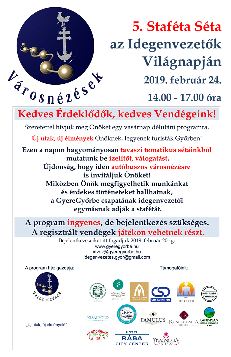 Ebben az évben az Idegenvezetők Világnapjának programjait támogatja Győr Megyei Jogú Város Önkormányzata és a Győr-Moson-Sopron Megyei Kereskedelmi és Iparkamara is, így a már hagyományos Staféta-sétán kívül újdonságként autóbuszos városnézésre és a Városháza Dísztermének látogatására is várják a vendégeket a szervezők.
