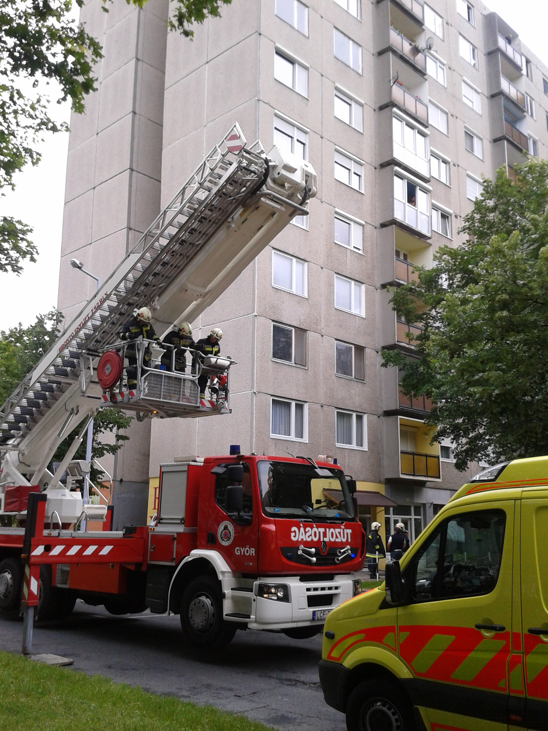 Ma délután két tűzoltó és egy mentő vonult ki az egyik Kodály Zoltán utcai tízemeleteshez. Szemtanuk információja szerint egy idős hölgy esett el lakásában, és őt próbálták daru kocsival, majd a zárt ablakok miatt az ajtó felfeszítésével kiszabadítani.