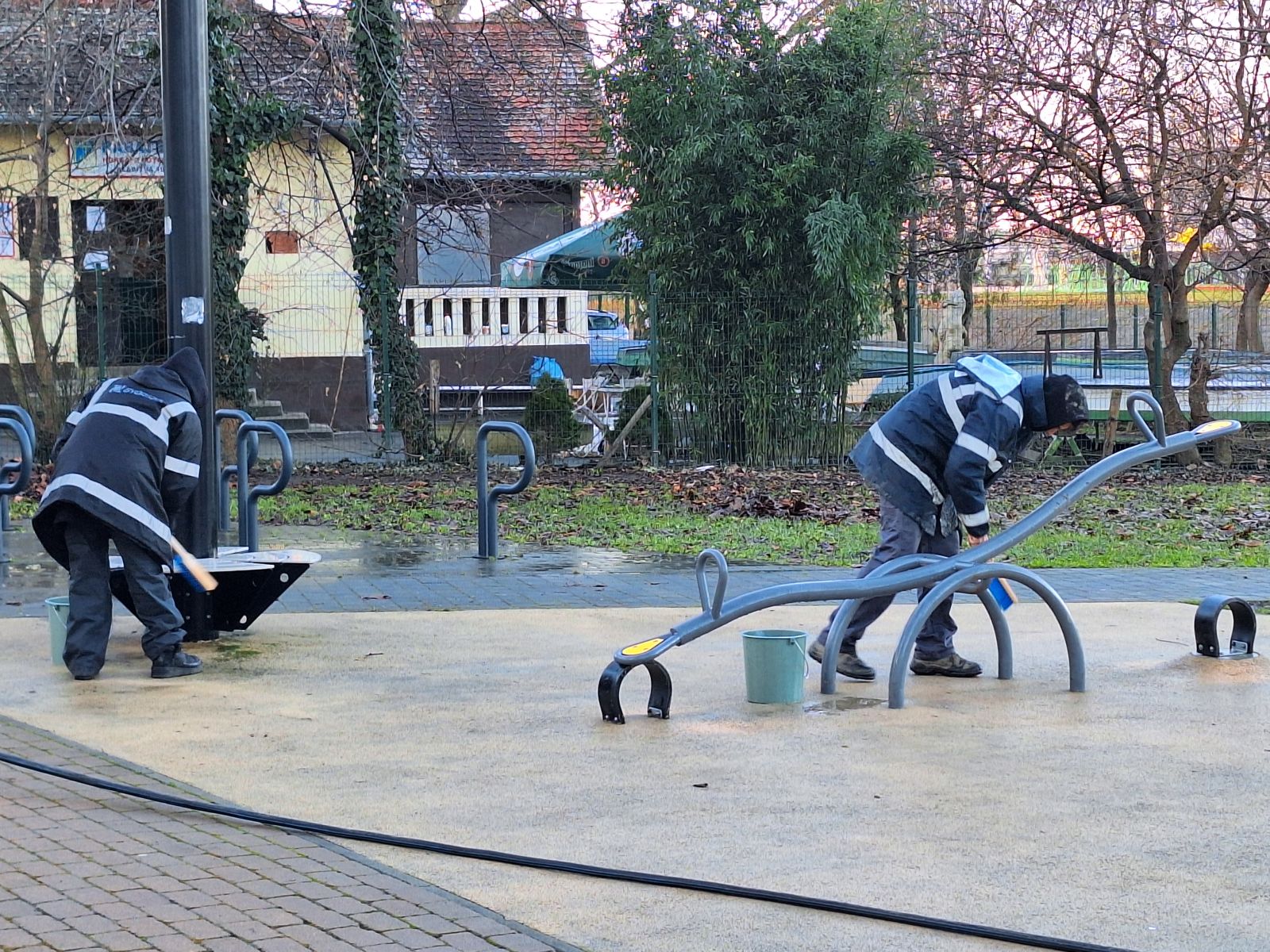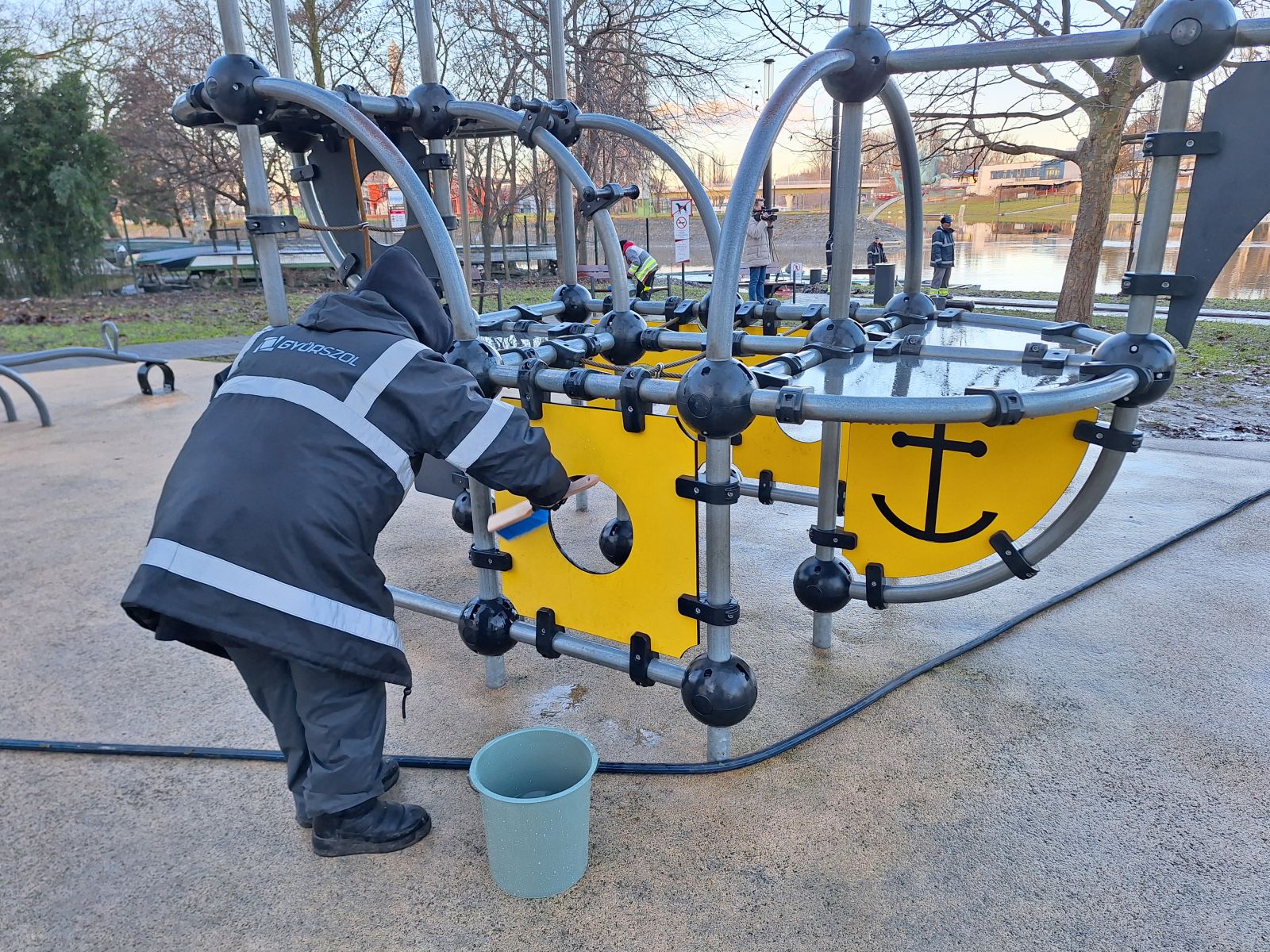 Ezekben a napokban zajlik a rakpartok tisztítása is azokon a szakaszokon, ahol a vízállás ezt lehetővé teszi. A rézsűkről nagynyomású vízsugárral távolítják el a lerakódott iszapot, és takarítják a parti sétálóutakat, járdákat, padokat, utcabútorokat is. A püspökvár alatti játszótéren az eszközöket kézi erővel tisztították meg és fertőtlenítették.