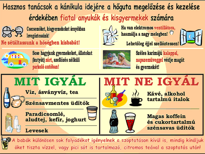 A győri önkormányzat kéri a lakosságot, hogy a forró napokban tartózkodjanak naptól védett, lehetőleg hűvös helyen! Fogyasszanak sok folyadékot, szükség esetén keressék fel a légkondicionált üzletközpontokat, egyéb klimatizált, vagy természetesen hűvös helyiségeket, amíg kellően lehűl a szervezetük!