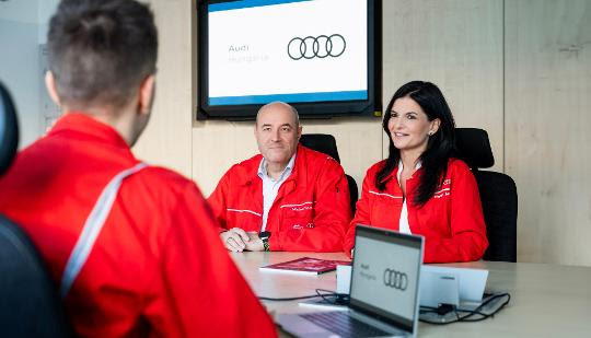 „Célunk, hogy biztosítsuk a vállalat jövőbeni versenyképességét. Ennek során elsősorban a hatékonyság növelésére, valamint termék- és szolgáltatásportfóliónk célzott továbbfejlesztésére összpontosítunk. Ez különösen nagy kihívást jelent az autóipar jelenlegi helyzetében, de munkatársaink szakértelmével és rugalmasságával meg fogjuk birkózni ezzel a kihívással" – mondta Achim Grewe, az Audi Hungaria igazgatóságának pénzügy, beszerzés, IT és compliance területekért felelős tagja. (Forrás: Audi)