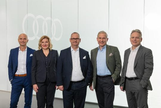 A fotón az Audi Hungaria igazgatósága, balról jobbra: Les Zoltán, járműgyártásért felelős igazgatósági tag, Németh Kinga, személyügyért és szervezetért felelős igazgatósági tag, Michael Breme, az igazgatóság elnöke, Achim Grewe, pénzügy, beszerzés, IT és compliance területekért felelős igazgatósági tag és Peter Will, motorgyártásért felelős igazgatósági tag.