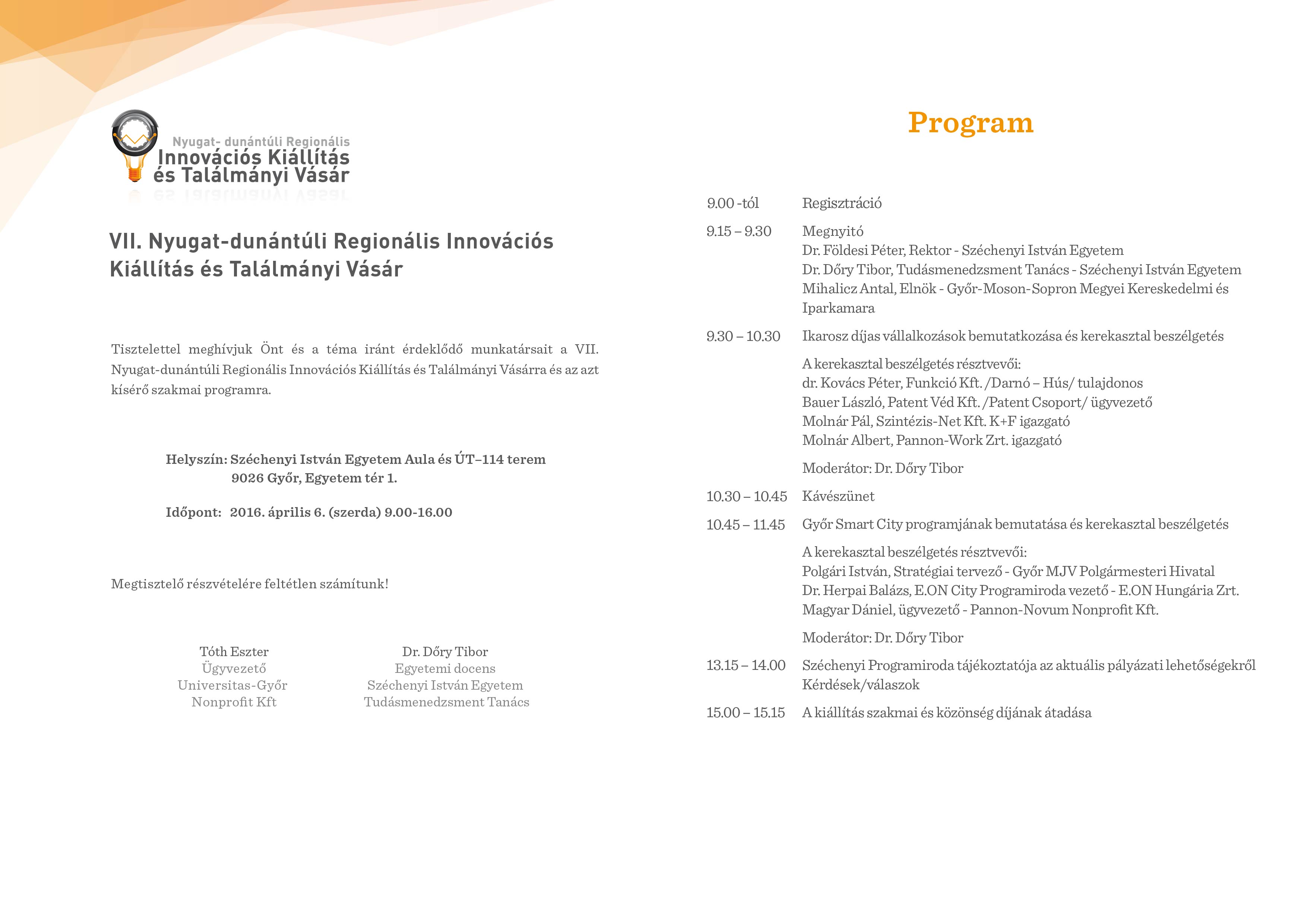 A hetedik alkalommal megrendezett esemény érdekes programot ígér azoknak, akik 2016. április 6-án, szerdán ellátogatnak a Széchenyi Egyetem aulájába. Harmincöt standon mutatkoznak be azok a találmányok, amelyek néhány év múlva talán a mindennapjaink részei lesznek. Elsősorban kisebb cégek, kezdő vállalkozások és egyéni fejlesztők innovatív találmányai tekinthetők meg, akik a bemutatkozási lehetőség mellett a kapcsolatépítés céljával jelentkeztek a rendezvényre.