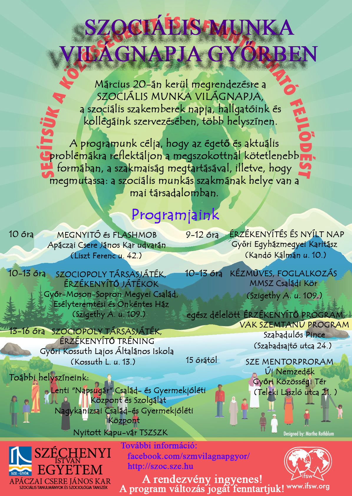 A program kínálatról a Facebook oldalunkról: https://www.facebook.com/szmvilagnapgyor/ és a tanszék honlapjáról http://szoc.sze.hu/hirek