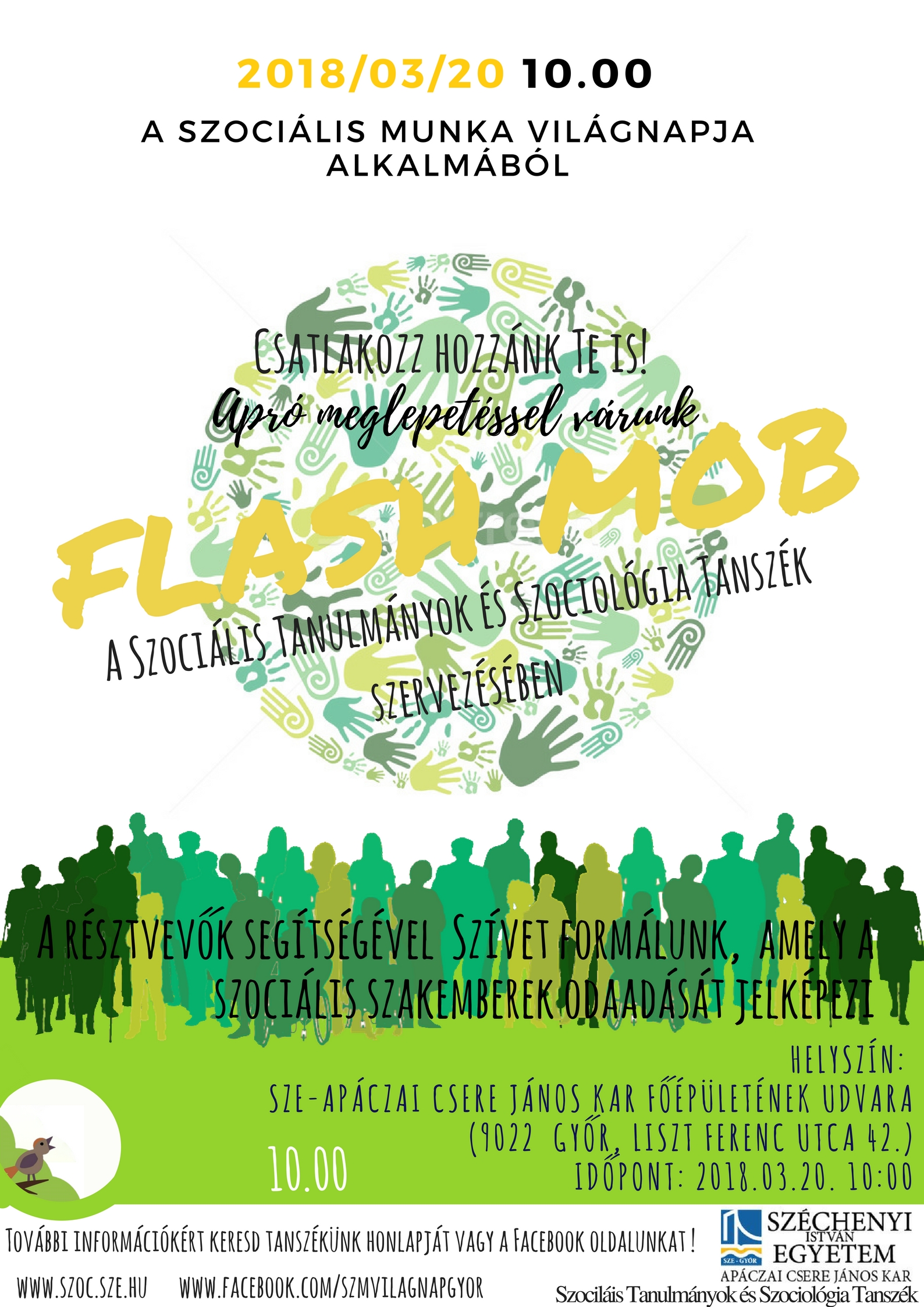 10 órakor megnyitó és flashmob az Apáczai Csere János kar udvarán, (Győr, Liszt Ferenc u. 42.), összegyűlünk, és szíveket formáló élőképpel hívjuk fel a figyelmet a szociális szakemberek odaadására és a szociális szférára.