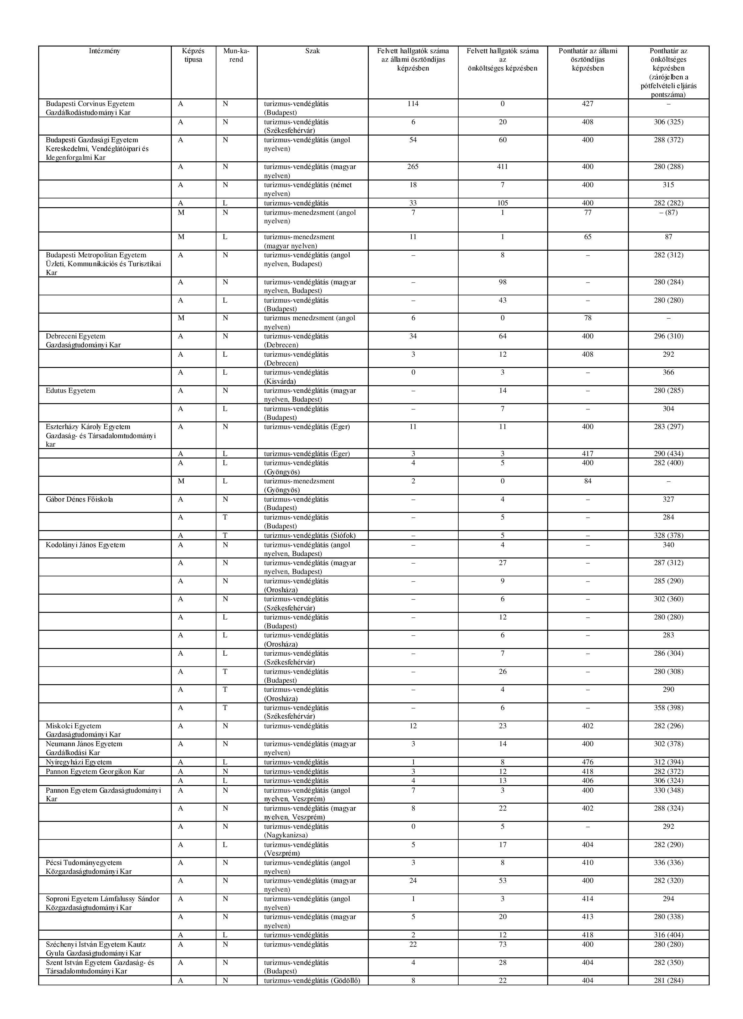 A Budapesti Corvinus Egyetemen 140 fő, a Budapesti Metropolitan Egyetemen 155 fő, a Debreceni Egyetemen 116 fő (a Neumann János Egyetem augusztus 1-től ide tartozó Gazdálkodási Karával együtt 133 fő) kezdheti meg ősztől turizmus-vendéglátás alapképzési szakon a tanulmányait.