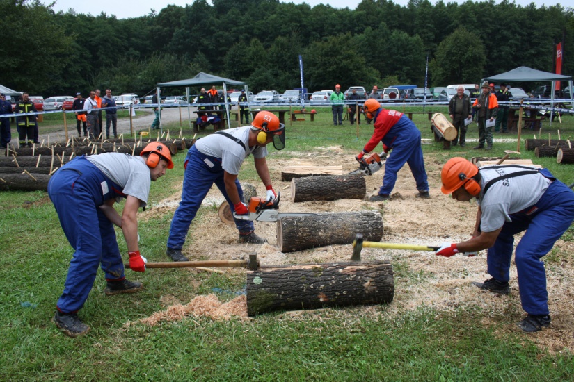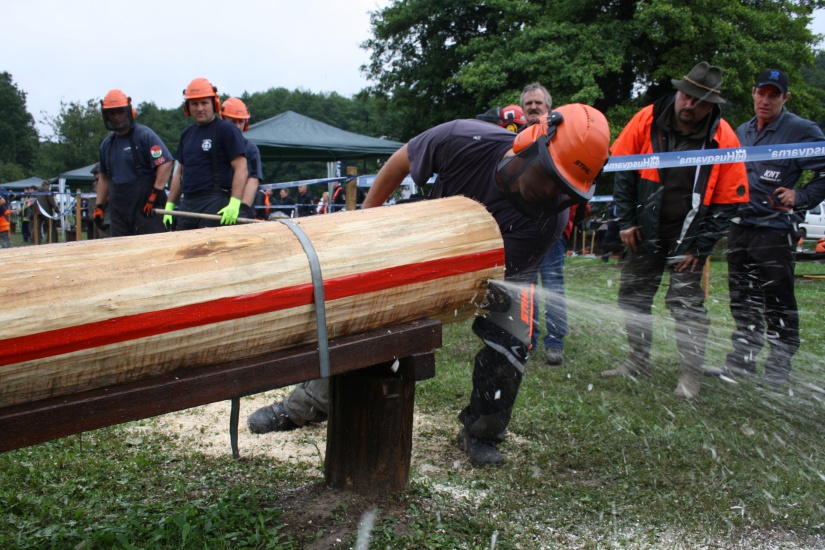 Az égi áldás csillapodásával a kombinált verseny is elrajtolt. Hol szemerkélő esőben, hol ragyogó napsütésben lépett pályára elsőként a csapatok motorfűrész-kezelője, aki egy minimum harminc, maximum nyolcvan milliméter vastagságú korongot vágott le egy rönkről. A korong földre érkezését követően a csapat többi tagja is hozzáfoghatott feladatához, két, egyenként négy méteres rönköt kellett legallyazni, majd egyméteres választékokra darabolni, félbehasítani és sarangba (rakatba) rakni.
