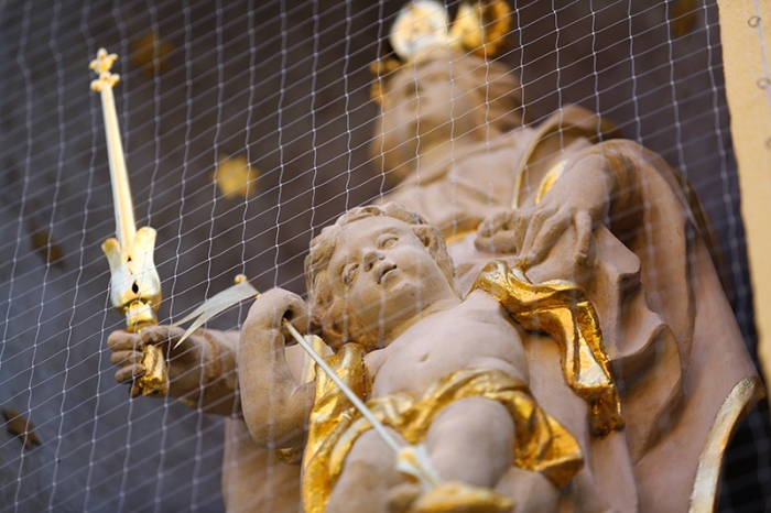 Mivel nem állt rendelkezésre hiteles leírás vagy fotó a korábbi állapotról, ezért az attributumokat analógiák alapján, szakmai zsűri felügyeletével sikerült megmintázni és végül kialakítani, kézzel legyártani. Ez azt jelenti, hogy sok hasonló korú és formájú, témájú szobrot elemeztek a szakemberek, megnézték, melyik szobornak milyen attributuma van, és az alapján tervezték meg a formákat, melyekre végül az örökségvédelmi hatóság is rábólintott, és engedélyezte a restaurálás befejezését – ismertette Erős Erika.