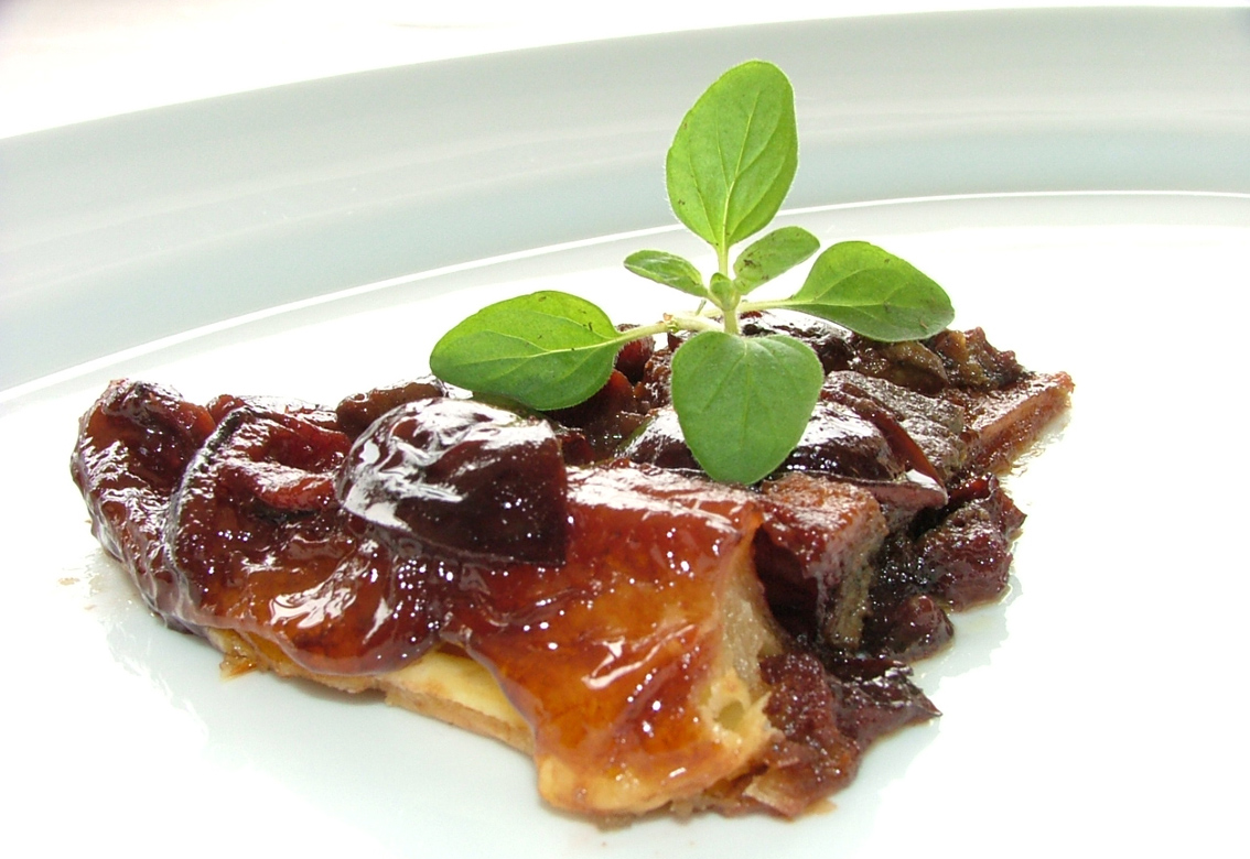 Saját zsírjában izzó libamáj balzsamos meggyel, burgonyalángossal