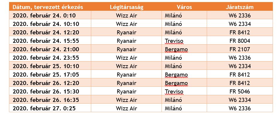 Az érintett észak-olaszországi régiókból a következő napokban az alábbi járatok várhatók: