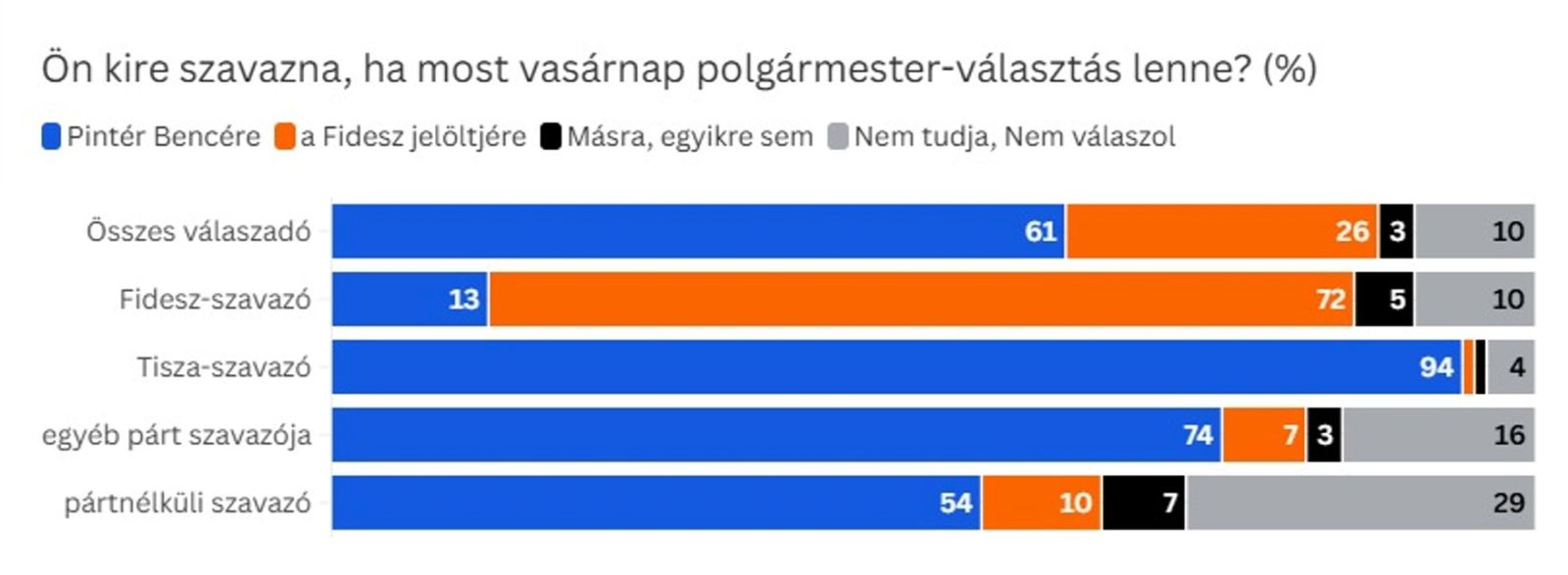 A bizonytalanok 54 százalékuk szavazna rá, szemben azzal a 10 százalékkal, aki a Fidesz jelöltjét favorizálná. Még a fideszes szavazók is némileg megosztottak a kérdésben: 72 százalékuk ugyan a saját oldal jelöltjére szavazna, ám 13 százalékuk inkább a jelenlegi polgármestert preferálta.