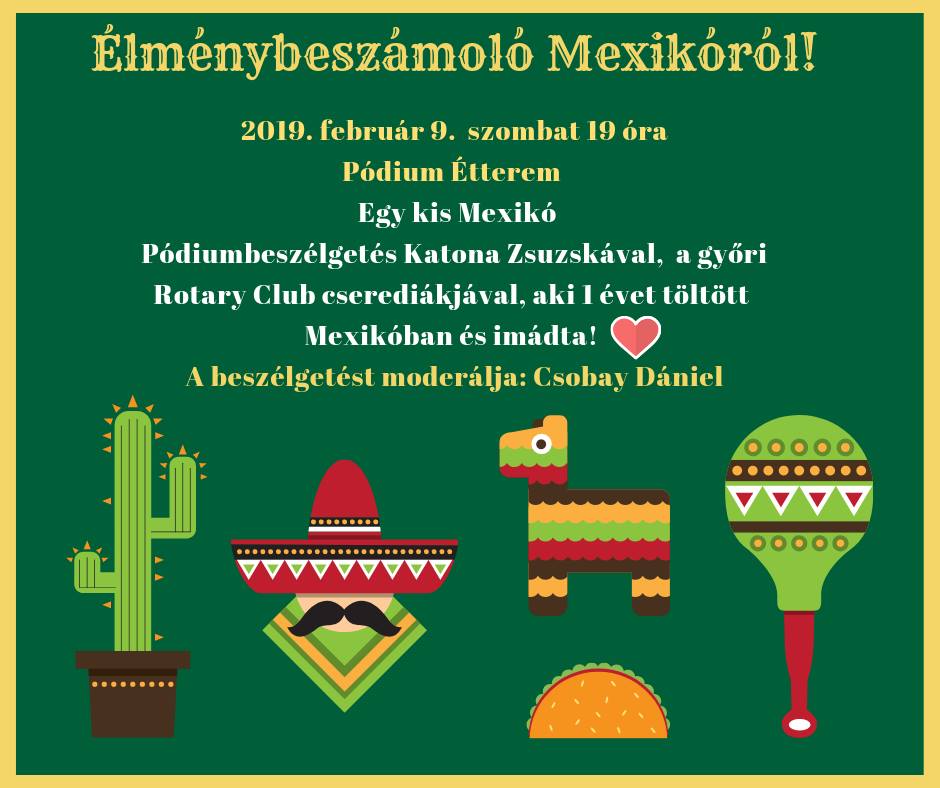 Az szombat este programját színesíti egy vetítéses élménybeszámoló Mexikóról. "Egy kis Mexikó" címmel pódiumbeszélgetés Katona Zsuzskával a Révai Gimnázium diákjával, a Győri Rotary Club cserediákjával, aki 1 évet töltött Mexikóban és imádta.
