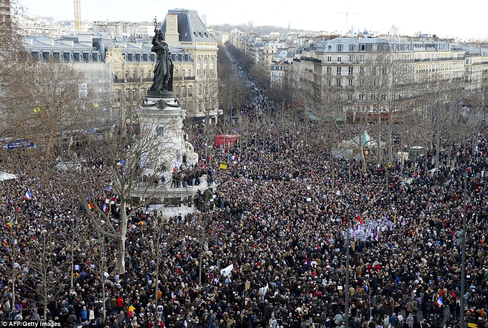 Példátlan tömegek alakultak Párizsban, ahol több millióan sétáltak a főváros utcáin kántálva a "Je suis Charlie" (Én is Charlie vagyok!) jelmondantot.