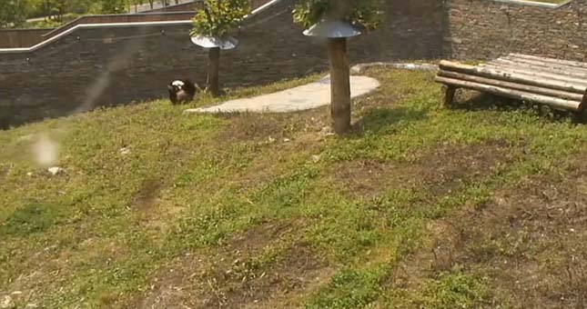Hua Rong a kínai Wolong Grove pandarezervátum egyik fiatal lakója, aki különös játékkal szórakoztatja magát.