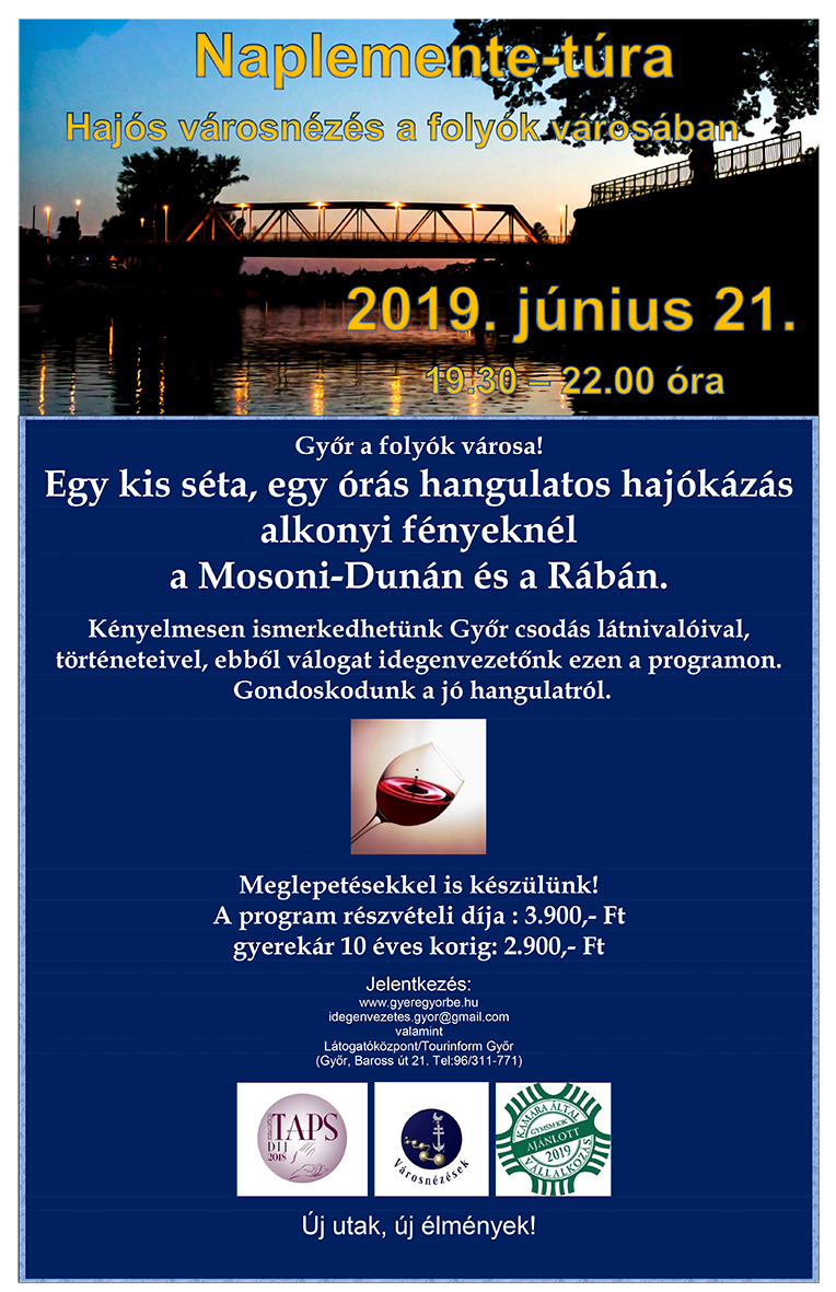 2019. június 21-én, a Múzeumok Éjszakája hétvégéjén, 19.30 órától "Naplemente-túra", hajós városnézésre vár a GyereGyőrbe Tematikus városnézések és Élményprogramok csapata.
