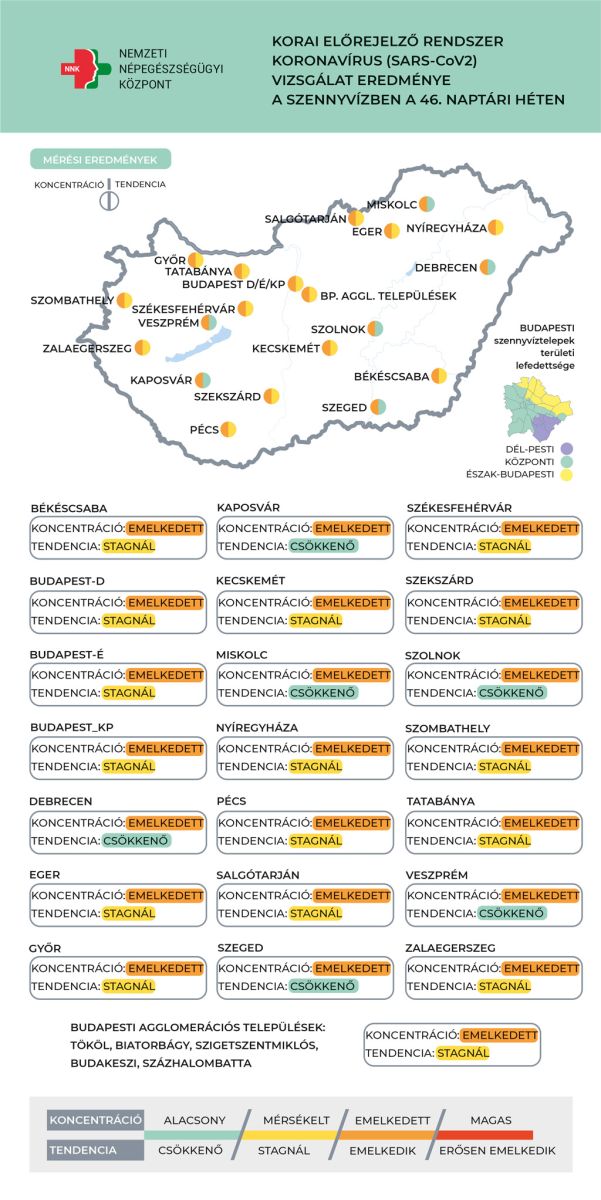 Mint írták, a 46. héten országos átlagban tovább csökkent a szennyvízben a koronavírus örökítőanyagának koncentrációja. A vizsgált városok többségét pedig stagnáló tendencia jellemzi. Győrben a koncentráció emelkedett, a tendencia stangnál. Csökkenés Debrecenben, Kaposváron, Miskolcon, Szegeden, Szolnokon és Veszprémben tapasztalható. Hozzátették a koronavírus örökítőanyagának koncentrációja minden mintavételi helyen továbbra is az emelkedett tartományba esik.
