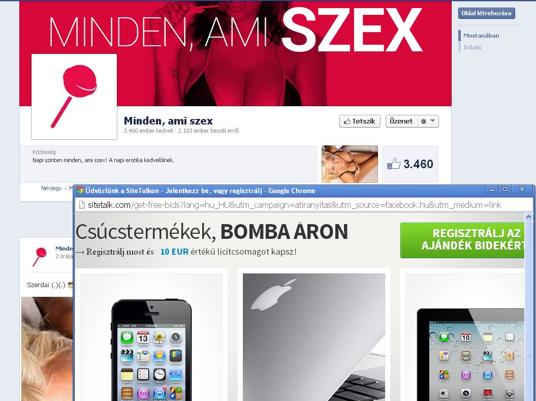Az ötödik. Ha valaki véletlenül elüti, siet, nem figyel oda, és facebook.com helyett facebook.hu ír be, akkor jön egy felugró ablak, mely a SiteTalk oldalt reklámozza, ahol szuperebbnél szuperebb ajánlatokat nézhetek meg, illetve az eredeti böngésző ablak átnavigál a valódi facebookra, viszont ott is az arcomba nyom egy adott oldalt, reklámozva azt. A jelen esetben a "Minden, ami szex" oldalt kaptam :)