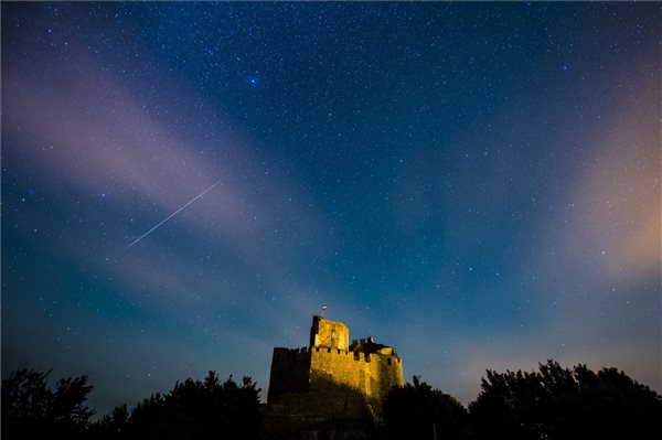 Egy meteor látszik az égbolton Hollókő közelében 2016. augusztus 12-én. A Föld belépett a Perseida meteorraj összetevőit alkotó 109P/Swift-Tuttle üstökös pályája mentén szétszórt porfelhőbe. MTI Fotó: Komka Péter