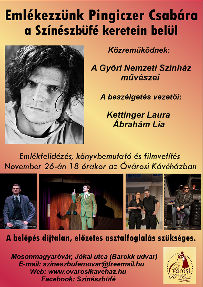 Az Óvárosi Kávéházba várnak mindenkit, aki szerette Csabát, akinek legemlékezetesebb szerepeinek egyike, Egressy Zoltán: Portugál tragikomédiájában Sátán alakítása. Pingiczer Csaba idén lenne 36 éves.