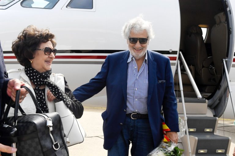 Plácido Domingo spanyol operaénekes, karmester érkezik a Liszt Ferenc repülőtérre felesége, Marta Domingo társaságában 2019. augusztus 26-án