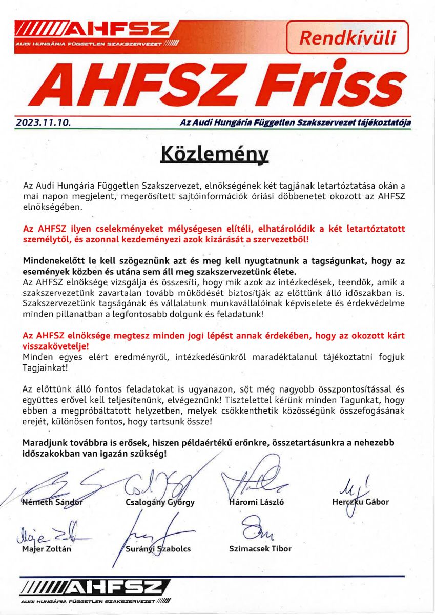 Mint már írtuk: több száz millió forintot csalhatott el az Audi-szakszervezet ket elnoksegi tagja. Erre az Audi Hungária és az AHFSZ is reagált: