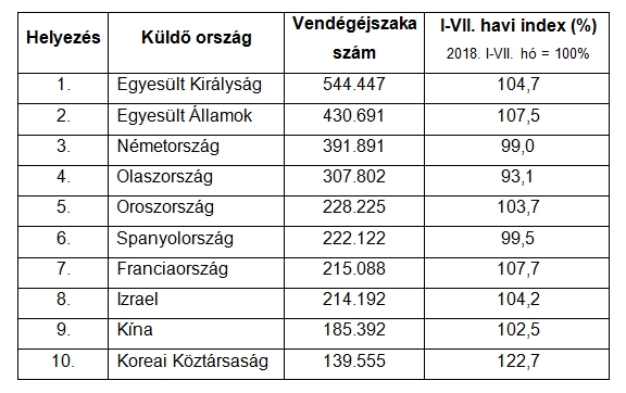 Budapest top 10 küldőpiaca a kereskedelmi szálláshelyek vendégéjszakái alapján (2019. január–július):