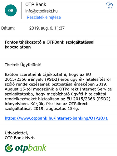 Kérik ügyfeleiket, ne kattintsanak a megadott linkre, az internetbanki szolgáltatásokat csak az OTP Bank honlapjáról közvetlenül elérhető OTPdirekten, vagy a mobilbanki applikáción keresztül vegyék igénybe.