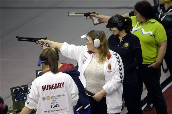 A légpisztoly versenyszám hivatalos edzésén a 10 méteres sportlövő Európa-bajnokságon Győrben 2016. február 26-án.