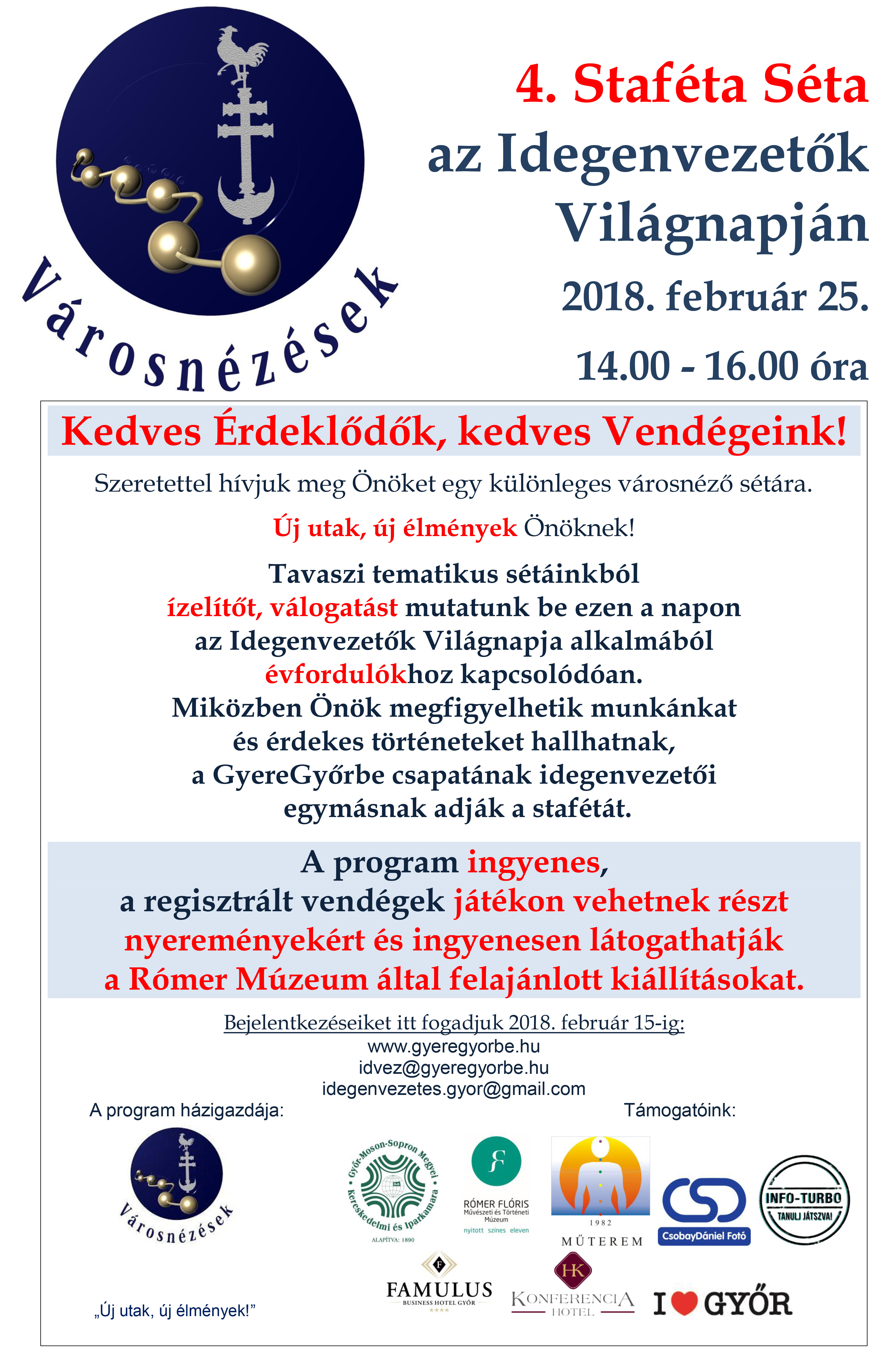 Ez a világnap a szakma ünnepe, mi is nagyon készülünk erre minden évben, hiszen a téli hónapok után ez az első nagy találkozásunk a vendégekkel, ami egy kicsit már a tavaszvárásról is szól. Február 24-én a 8. Turizmus Bálon kezdjük a „felkészülést” a vasárnapi sétára, amit a bálozás miatt délután vezetünk idegenvezető kollégáimmal. Talán a vasárnapi húsleves után szívesen sétálnak velünk ebben az évben is sokan. Komolyra fordítva a szót a 4. Staféta Sétánkra készülünk. A séta témája az „Évfordulók” lesz. Számos várostörténeti és alkotóművészhez kapcsolódó évforduló közül válogattunk és ez rajzolja meg a séta útvonalát. Ez a 2 órás program válogatás, ízelítő tematikus sétáinkból egy más koncepció szerint, ahol „új utak, új élmények” várják vendégeinket.