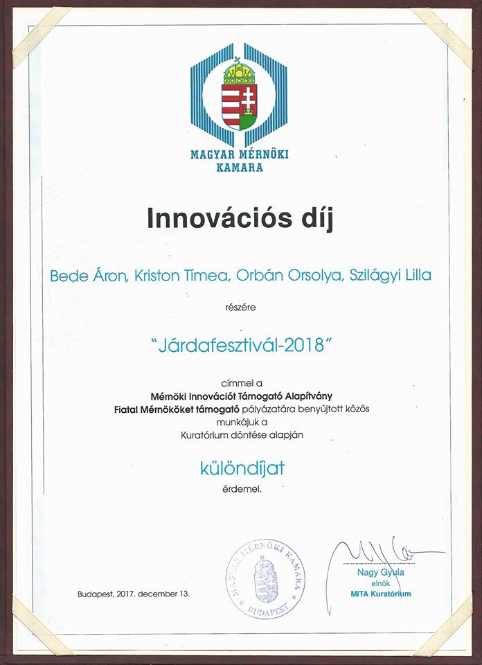 "A Magyar Mérnöki Kamara Innovációs különdíjában részesültünk a múlt héten. Három kollégánk, Kriston Tímea, Orbán Orsolya és Szilágyi Lilla Bede Áron közlekedésmérnökkel együtt a Rákóczi út jelenleg kizárólagos közlekedési funkcióját gondolták újra, megkérdőjelezve Budapest legközpontibb területének jelenlegi felhasználási módját. A Blaha Lujza tér és az Erzsébet híd közötti útszakasz közterületté alakul át egy egész nyáron át tartó „Járdafesztivál” keretében, így helyet kapnak vendéglátó teraszok, napozóágyak, színpadok, koncerthelyszínek, és összefüggő zöldfelületek is a Rákóczi út homogén betontengerében.