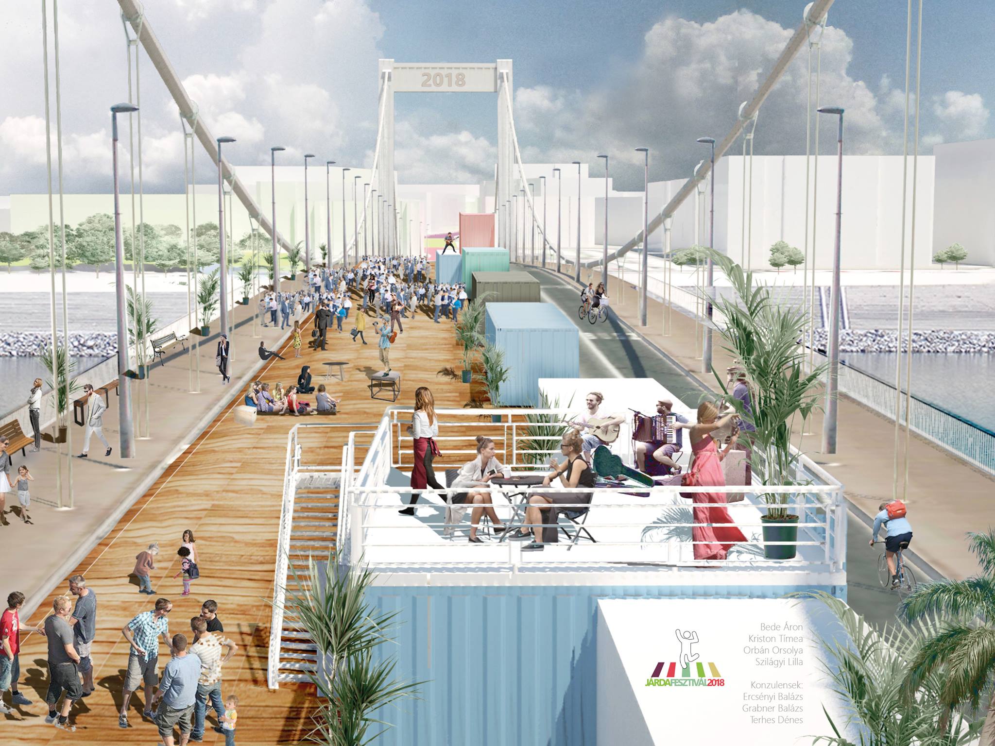 A projekt kiemelt, ikonikus helyszíne és eleme az Erzsébet híd, ahol egy igazán különleges és Európában egyedülálló hangulatú koncert- és rendezvényhelyszínné alakul át. Konténerek tetejére helyezett vendéglátó teraszokról 360°-os panorámában lehetne gyönyörködni." - írja pontosan a közösségi oldalon a Korzó Tervezési Stúdió.