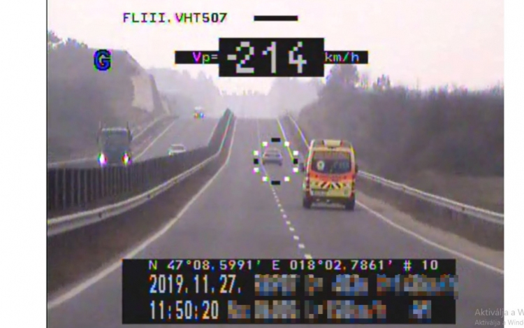 A veszprémi rendőrök november 27-én 11 óra 50 perckor a 8-as számú főút 35. kilométerszelvényében, Veszprém felől Várpalota irányába sebességellenőrzésük közben egy személyautót mértek be, ami az útszakaszon megengedett legnagyobb sebességet – 110 km/h – átlépve, 214 kilométeres sebességgel közlekedett. Az 55 éves csobánkai sofőrt a rendőrök megállították a megkülönböztető jelzéssel szerelt, civil jellegű szolgálati kocsival, és közigazgatási bírságot szabtak ki vele szemben.