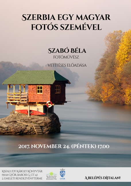 A díjtalan, vetített képes előadást a Kisfaludy Károly Könyvtár rendezvénytermében (Győr, Baross G. u. 4.) tartja. Profi fényképei segítségével virtuális túrát tehetnek a varázslatos balkáni országban, Szerbiában.