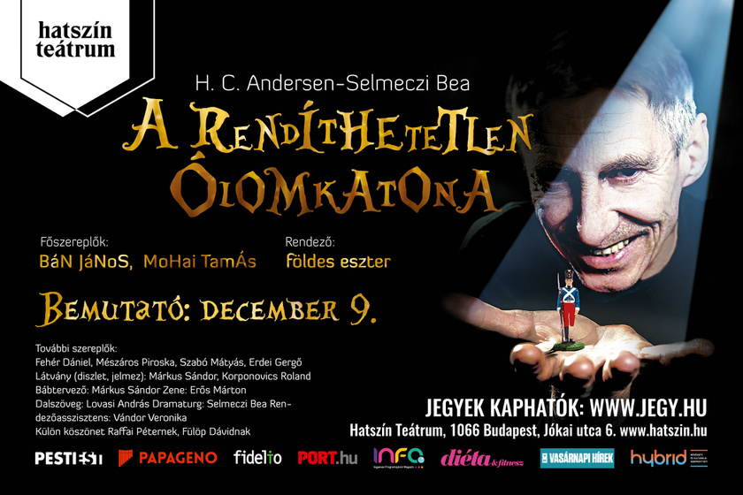 - Ma, a modern kütyük és okostelefonok világában nagyon fontos, hogy ne hagyjuk feledésbe merülni klasszikus történeteinket. Vigyáznunk kell ezekre, a színháznak különösen. De, mert mi mindannyian ebben a világban élünk, élnünk kell ezekkel a kütyükkel. Okosan kell őket használnunk. Úgy, hogy közben ne vesszen el a személyes történetmesélés varázsa. Ez egy gyerekeknek íródott felnőtt mese. Szól a szerelemről, a szeretet erejéről, a töretlen hitről, kitartásról. Arról, hogy ne szégyelljük a másságunkat. Mert az erőnk éppen abban van, hogy mindannyian egyediek és megismételhetetlenek vagyunk - mondja a rendező. Nincs színpad, sem nézőtérA rendíthetetlen ólomkatona látványvilágát az egyik legtehetségesebb fiatal látványtervező, Márkus Sándor készítette, Korponovics Roland intermédia művésszel közösen. Nincs színpad és nézőtér, mindannyian egy elvarázsolt gyerekszobában ülünk. Mi, nézők is részei vagyunk a történetnek, melyet Bán János és Mohai Tamás mesél, játszik, bábozik el. A további szerepekben: Fehér Dániel, Mészáros Piroska, Szabó Mátyás és Erdei Gergő.