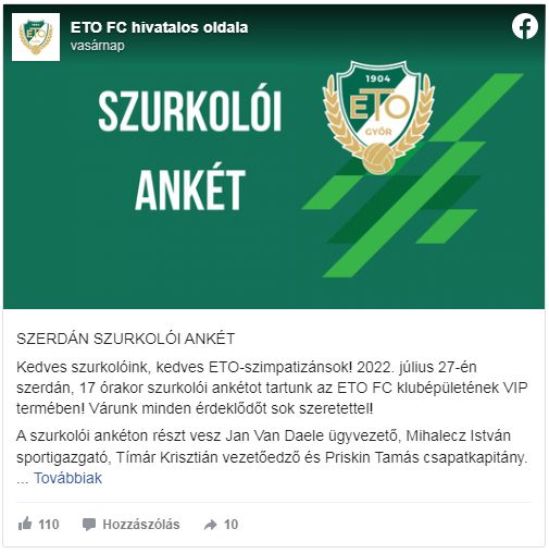 Július 27-én szerdán, 17 órakor szurkolói ankétot tartanak az ETO FC klubépületének VIP termében – közölte a győri klub.