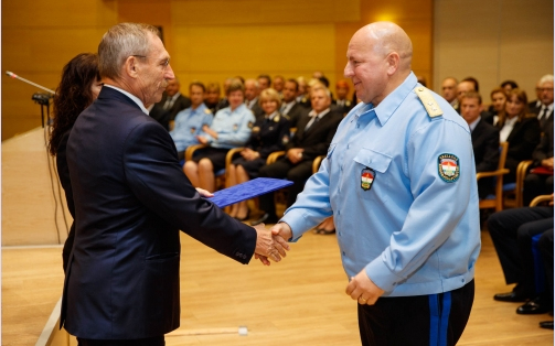 Dr. Pintér Sándor, Magyarország belügyminisztere az állománygyűlésen adta át vezetői kinevezési okmányát a TIBEK főigazgatójának, dr. Takács Tibor vezérőrnagynak.