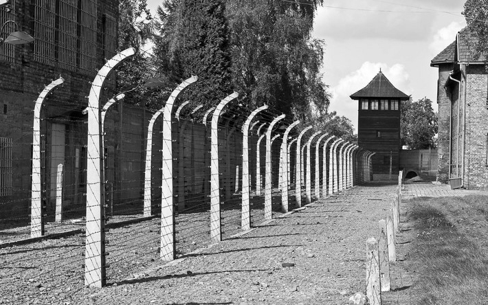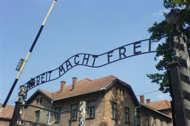Az auschwitzi láger kapuja a hírhedt „A munka szabaddá tesz” felirattal.