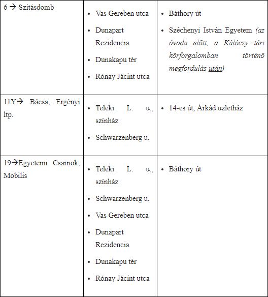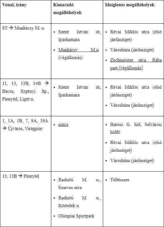 A Szent István út északi oldalának lezárása miatt a Munkácsy M. u.. Virágpiac, Bácsa, Ergényi ltp., Pinnyéd, Liget u. irányába az érintett autóbusz járatok a Révai Miklós utcán áthaladva közlekednek, az alábbiak szerint: