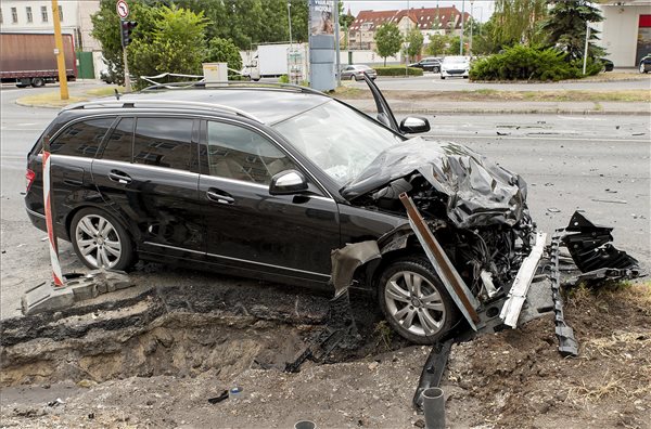 Összetört tűzoltóautó Győrben, ahol a gépjármű összeütközött egy személyautóval 2016. július 14-én.