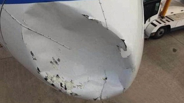 A szakértők értetlenül állnak az eset előtt, egyelőre nem tudják, hogy mi okozta a Boeing 757-es repülőgép orrán a horpadást.