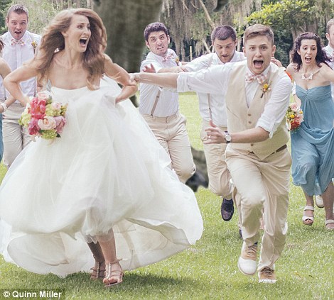 Úgy tűnik, a hagyományos esküvői beállított fotózás már kezd elcsépelté válni. A párok különleges, egyedi esküvőt szeretnének, az őrültség mértéke, pedig már csak a házasodni kívánók fantáziáján múlik. Az egyik legkiemelkedőbb esküvői fotót Quinn Miller készítette és szerkesztett rá egy óriás dinoszauruszt. A férj nagy rajongója az óriás hüllőknek, innen jött az ötlet, hogy lehetne a kép koncepciója az, hogy a násznép menekül dinoszaurusz elől.